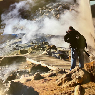 Despite its wonder few visitors seemed to find their way there. Here the mud gurgled and plopped as it boiled and water from the springs was also at almost boiling point! Steam issued from fissures engulfing us and at times we disappeared from sight as we walked on the boardwalks themselves scorched and burnt in many places