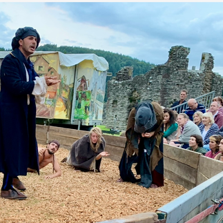 Sitting in the front row health and safety rules were not apparent and we loved every minute! The footlights were even a fire which burned beyond the board which separated us from the performance area and inches from grandson Zak. At one point a goat ate part of the set and the horse thundered and crashed into the board making my daughter gasp! The same horse nuzzelled her husband thinking he might be holding an apple while the 'dead' woman's flaying hand brushed against my face as her body hung lifeless from the saddle of a galloping stead.